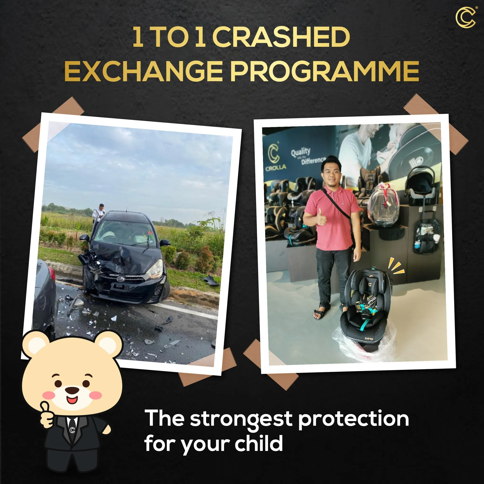 Program 1-1 Crash Exchange oleh Crolla Baby adalah inisiatif mementingkan pelanggan yang bertujuan untuk menyediakan penyelesaian yang lancar bagi ibu bapa yang menghadapi masalah dengan produk bayi mereka. Program ini memastikan bahawa pelanggan boleh menukar produk rosak mereka dengan penggantian yang baru.