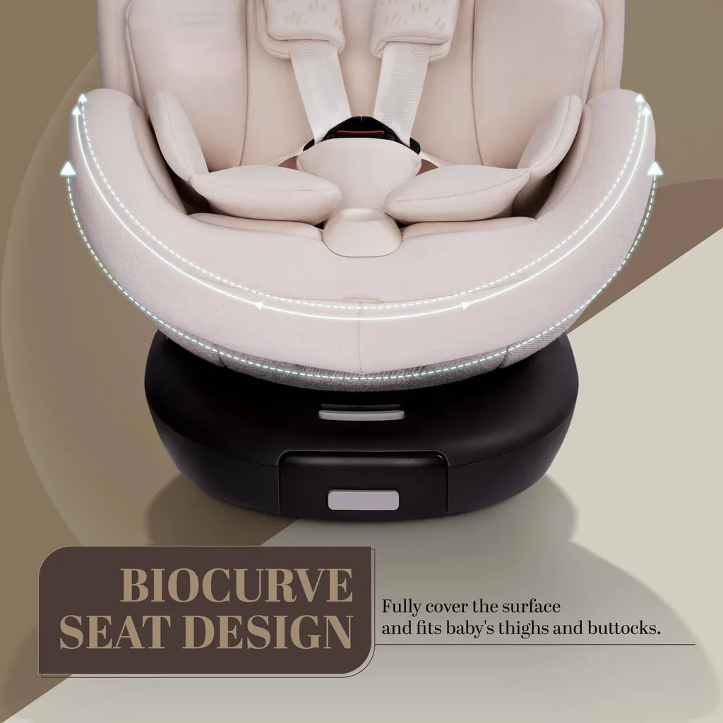 Convenience is key, with a 360-degree rotation allowing easy access to your child from any angle. Additionally, the one-hand adjustable headrest offers ten height positions for a custom fit. The biocurve seat design ensures comfort during long journeys, complemented by fun shoulder straps with silicone paw prints, adding a playful touch to travel.